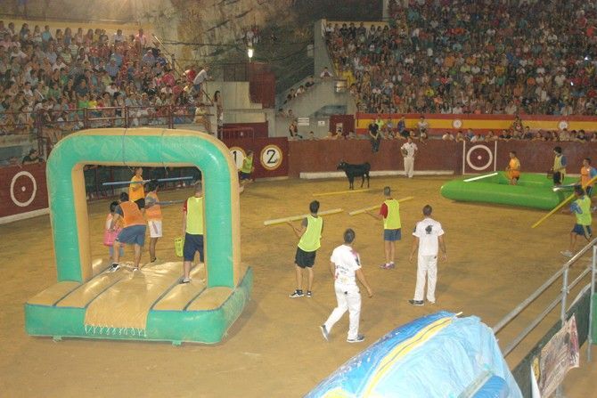 Por la noche, era el arranque de los actos taurinos. En una plaza abarrotada de gente, se celebraba un divertidísimo “Gran Prix”, en el que, entre otros juegos y obstáculos, algunas reses de la ganadería “La Espuela”, ponían en aprietos a dos equipos de jóvenes concursantes.
