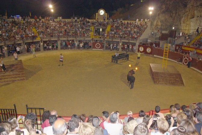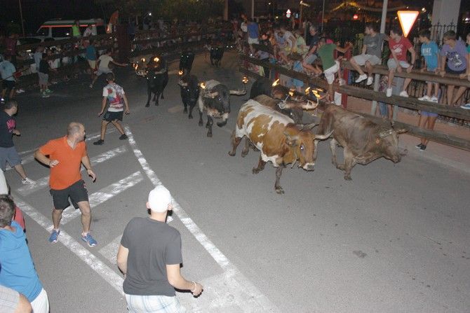 Oropesa del Mar celebró, la noche de este miércoles, su tradicional entrada de toros embolados, en este caso, diez astados de la prestigiosa ganadería de Fernando Mansilla.