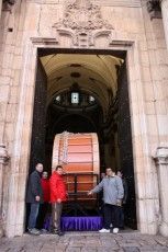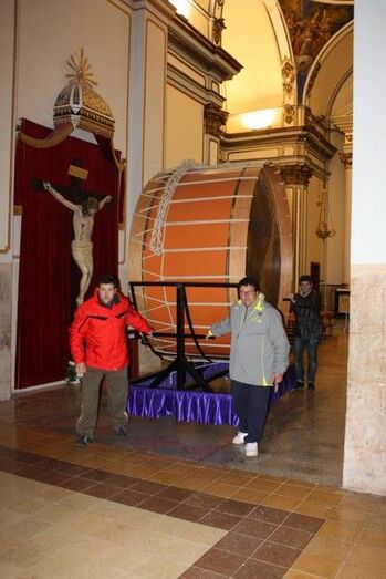 Para poder llevar a cabo este proyecto el primer paso ha sido trasladar el bombo desde la iglesia, donde permanece a lo largo de todo el año, a un local donde el pintor realizará su trabajo.