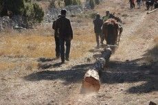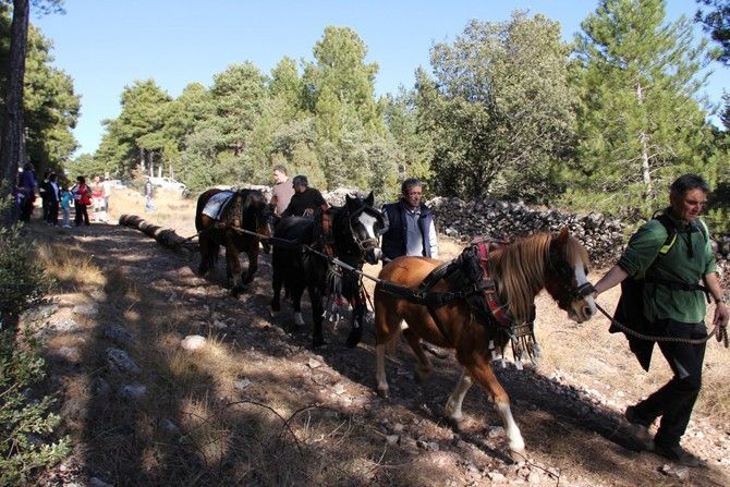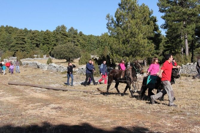 En el bosque, se cortan los pinos más rectos que señala el guarda forestal. Un total de veintiséis barras de menores dimensiones y cuatro que servirán para formar la estructura de la monumental barraca que se convertirá en una hoguera el próximo sábado tarde. En la montaña se viven escenas espectaculares de arrastre de los troncos por parte de los caballos alentados por sus dueños. En la recogida y transporte de los troncos han participado 300 personas con 22 caballerías.