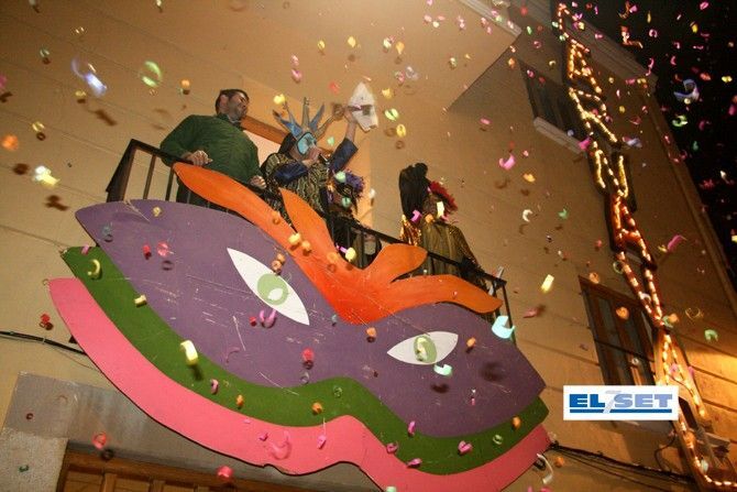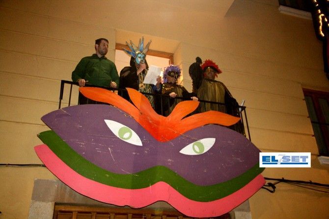 Centenares de vecinos de Alcalà se echaron a la calle ataviados con los más locos disfraces para participar en el recibimiento de Su Majestad Carnestoltes, que fue aclamado durante su pregón desde el Ayuntamiento de la localidad por sus fieles súbditos.