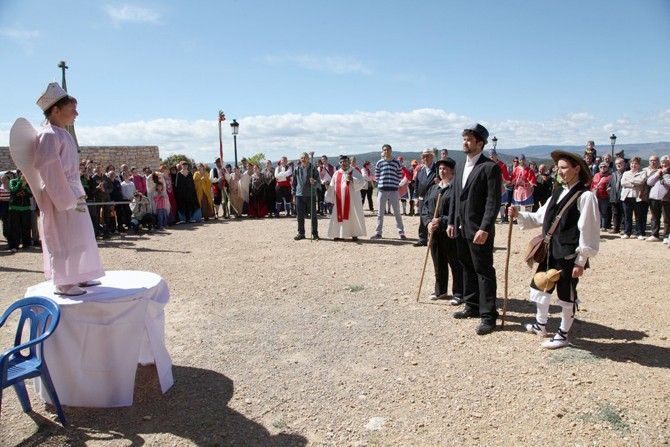 Cuando todos han llegado a lo alto de Sant Cristòfol, atravesando estrechos caminos, la procesión de bienvenida ha recibido a los peregrinos. En la recepción se ha representao el sainete entre el pastor, el galán y el amo