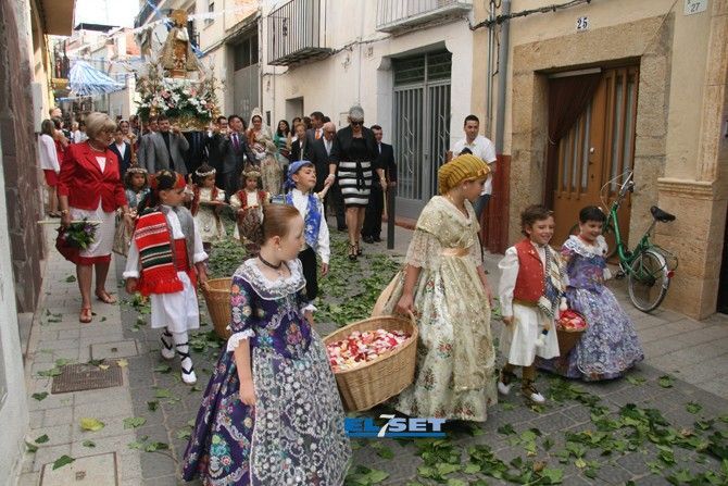 Delante de la comitiva, vecinos ataviados con trajes regionales portando cestas y ramos de flores, seguidos por los miembros de la cofradía, el estandarte y bandera de la Mare de Deu y a continuación la imagen de la Virgen de los Desamparados, acompañada por los ángeles que arrojan pétalos a su paso.