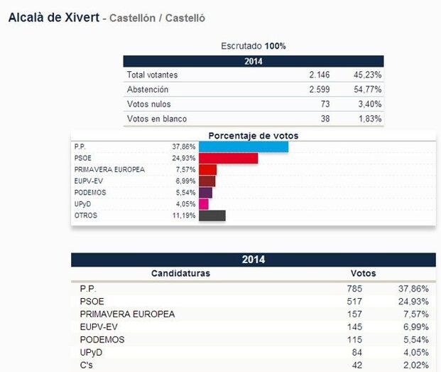 En Alcalà de Xivert, el PP ha obtenido en 2014 un total de 785 votos, frente a los 1130 obtenidos en 2009, mientras que el PSOE obtiene 517, siendo que en 2009 obtuvo 947, el BLOC obtuvo en 2009 en solitario 32 votos, mientras que integrado en la coalición Primavera Europea suma 157, EU sube a 145 votos y entran con fuerza Podemos (115 votos), UPyD (84 votos) y C’s (42 votos).