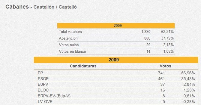 En Cabanes el PP ha obtenido 398 votos, en comparación a los 741 de 2009. El PSOE obtiene 233, mientras que en 2009 sumó 461 votos. Primavera Europea con 68 votos –frente a los 16 que obtuvo el BLOC en solitario- supera a EU como tercera fuerza, aunque incrementa a 64 votos su respaldo, por encima de los 37 votos que tuvo en 2009. Aparecen en esta localidad formaciones como Podemos (54 votos) y UPyD (52 votos).