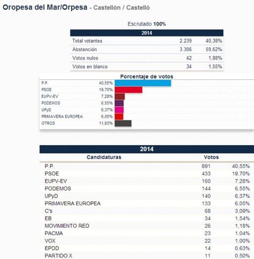 Oropesa del Mar tiene como primera lista al PP (891 votos, en 2009 tuvo 1211), seguido por el PSOE (433 votos, en 2009 tuvo 778), EU con 160 votos, superando los 30 obtenidos en 2009. Podemos entra con 144 votos, UPyD con 140 votos y Primavera Europea con 133 mejora las cifras del BLOC, que en 2009 recibió 75 votos.