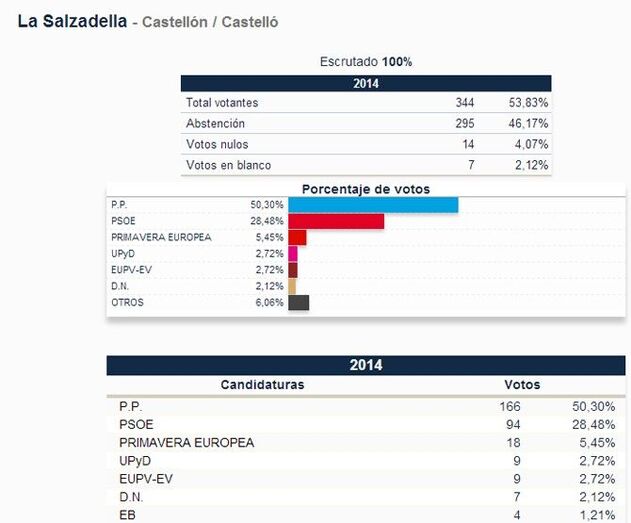 La Salzadella mantiene al PP como la lista más votada con 166 votos (aunque en 2009 recibió 243), mientras que el PSOE sigue segundo con 94 votos (habiendo recibido en 2009 159 votos). Primavera Europea mejora las cifras del BLOC con 18 votos (en 2009 recibieron 8) y aparecen UPyD y EU ambas formaciones con 9 votos.