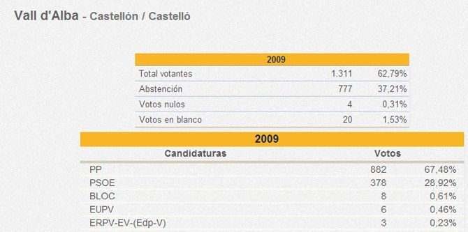 En Vall d’Alba, con un descenso en la participación respecto a 2009 de un 10%, entre las más importantes de los pueblos del entorno, el PP gana con 622 votos frente a los 882 de 2009 y el PSOE es segundo con 209 votos, habiendo obtenido 378 en 2009. entran con fuerza UPyD (55 votos), EU (48 votos), Podemos (39) y Primavera Europea mejora las cifras del BLOC, con 32 votos frente a los 8 obtenidos en 2009.