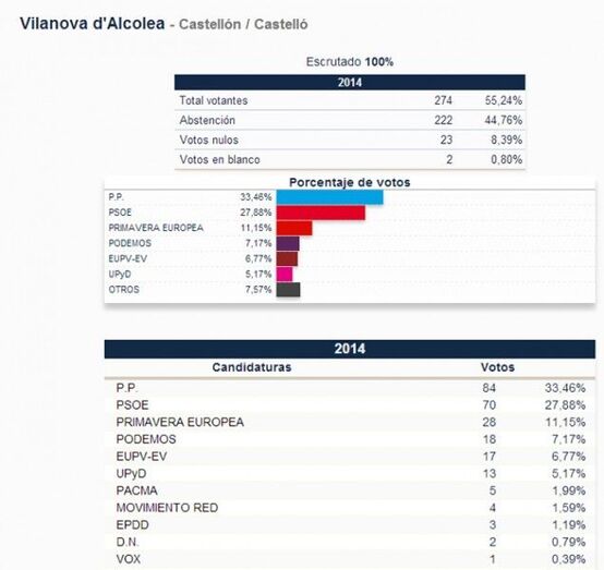 En Vilanova d’Alcolea se mantienen las tendencias a la baja, con el PP como primera fuerza con 84 votos (161 en 2009), con el PSOE en segundo puesto con 70 votos (146 en 2009). Primavera Europea mejora con 28 votos los 8 obtenidos en 2009 por el BLOC en solitario, mientras que irrumpen Podemos con 18 votos, EU con 17 votos y UPyD con 13.