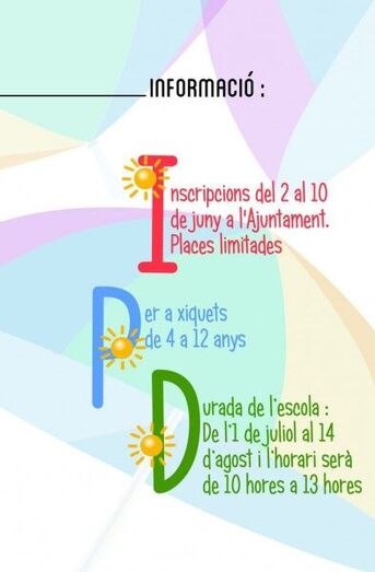 La Escola d’Estiu tendrá un horario de las 10:00 horas a 13:00 horas, aunque también se ofrece la posibilidad de inscribir a los niños para ampliar ese horario de 8:00 a 14:00 horas, teniendo en cuenta que son muchos los padres que trabajan y la escuela tiene como objetivo el fomento de la conciliación de la vida laboral y familiar.