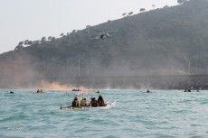 Terminada la teoría llegó la práctica. Comenzó la primera travesía, hacia el norte, pero también el ejercicio de rescate. Los piragüistas se hicieron a la mar. Uno de los piragüistas encendió una bengala de socorro, con humo de color naranja. Estaba situado junto al espaldón del Puerto de Oropesa, desde donde se puso seguir todo el ejercicio, en tierra, mientras el resto de los dragones lo observaban desde sus piraguas en el mar.