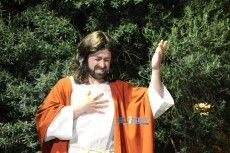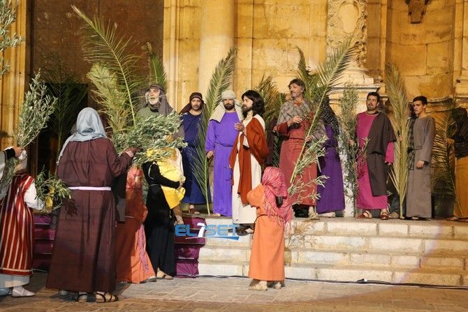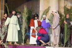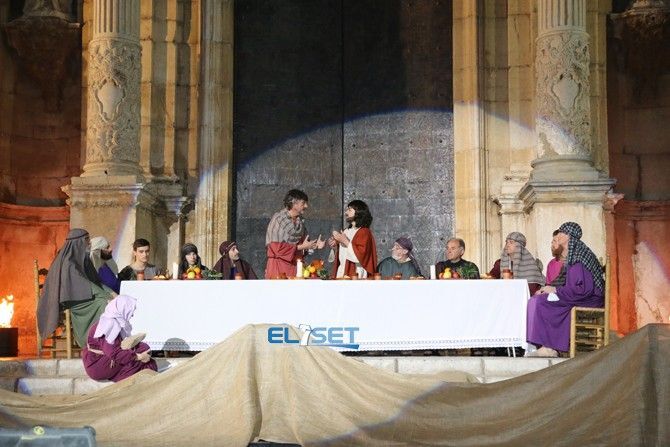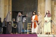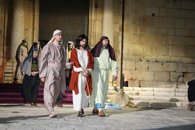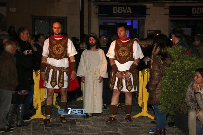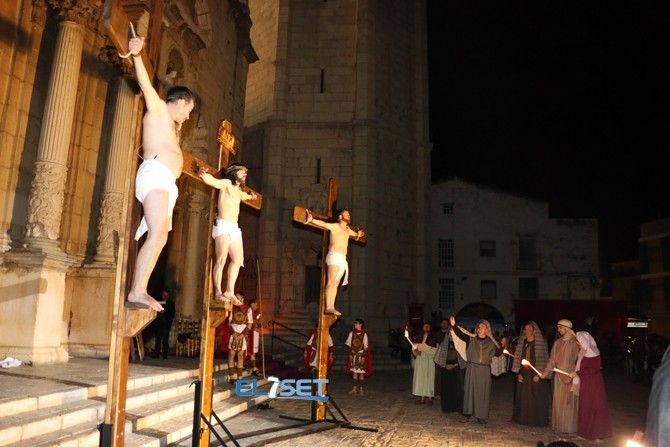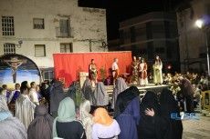 Las escenas del Vía Crucis sacaron la representación de su escenario principal para recorrer las calles adyacentes y regresar al punto de partida, donde se puso en escena la crucifixión, la Piedad y la Resurrección, escena esta última que tuvo lugar desde la base de un monumento tan emblemático para la localidad como es su Campanar.