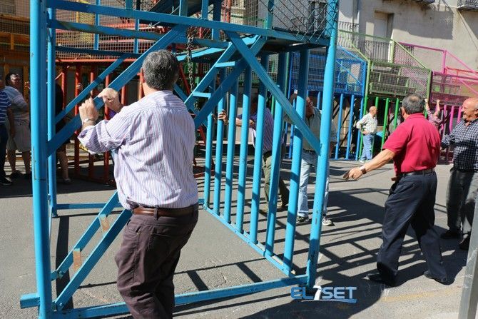 El tradicional montaje de la plaza de toros marca el inicio de los festejos taurinos dentro del programa de las Fiestas de Mayo que se celebran en Cabanes. Las collas y grupos de amigos se congregaron en el recinto para la instalación de los carafales en sus respectivas ubicaciones.