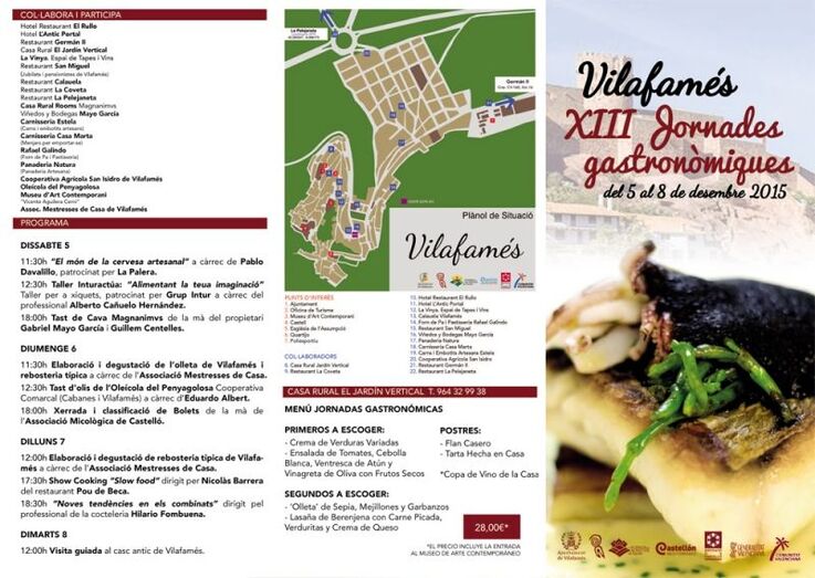 Vilafamés rebrà durant quatre dies a milers de persones. Aquest any, a més dels menús a degustar i els productes que es podran adquirir, els visitants tindran l'oportunitat d'aprofundir en la cultura gastronòmica. En matèria de cervesa artesanal Pau Davalillo donarà a conèixer l'elaboració més enllà de la producció industrial. Serà el dissabte dia 5 a partir de les 11.30h.