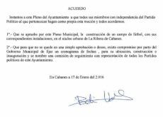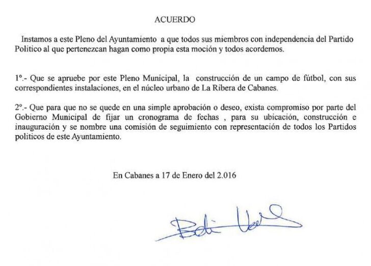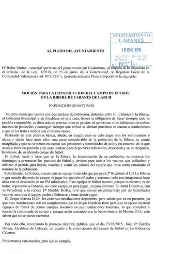 Respecte al contingut de la moció no deixava de ser més sorprenent, ja que instava a que l’ajuntament es fera càrrec de la construcció d’un camp de futbol en la Ribera de Cabanes; quan aquest camp de futbol el tenia que haver construït l’empresa Marina d’Or per haver destruït l’anterior. En cap cas es fa menció a este fet, i al contrari, es parla de la “benevolencia” de la empresa per deixar en l’actualitat instal·lacions en la veïna Orpesa.