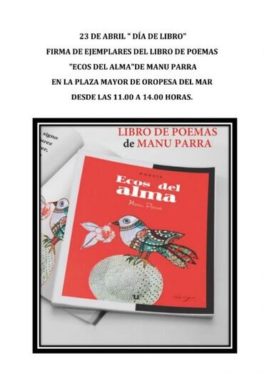 Durante la jornada, autores locales como Manuel Parra firmarán libros, en su caso, el ejemplar de poemas “Ecos del alma”. Los interesados también podrán adquirir uno de estos ejemplares.