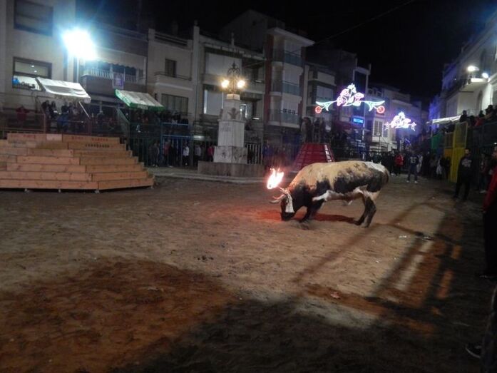 A las 23:00 h. tenía lugar la embolada del toro cerril patrocinado por el ayuntamiento de la localidad, a cargo de los emboladores locales ‘Hierro y Arena’. El toro, de nombre Chorona, pertenecía a la ganadería Conde Cabral y, ya en la prueba de la tarde, garantizó el espectáculo entre los asistentes mostrando su calidad y nobleza. A continuación, tuvo lugar el acto nocturno taurino patrocinado por la ‘A.C.Peña Els Gallos’, con un encierro de cuatro vacas novillas de la ganadería de Miguel Parejo Planell. Más tarde, se emboló a “yuquete” un último toro, de nombre Jardinero, patrocinado por la misma peña.