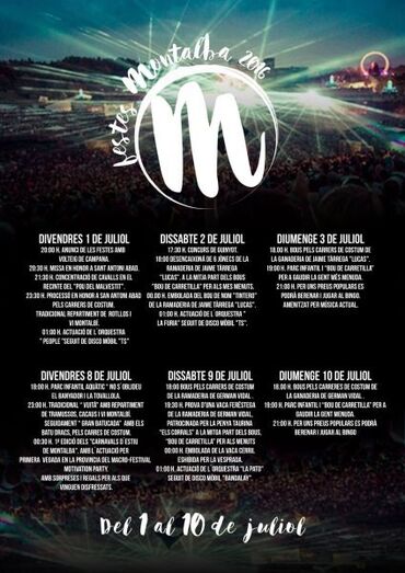 [Img #49951]Montalba está en fiestas. Una misa y una procesión en honor a Sant Antoni, así como la tradicional concentración de caballos, darán inicio hoy viernes 1 de julio a un interesante y atractivo programa de fiestas que, organizado por la comisión de fiestas, se alargará hasta el próximo 10 de julio, sumando dos largos e intensos fines de semana que convertirán a la pedanía de Vall d’Alba en el centro neurálgico de la juventud de toda la provincia gracias a sus multitudinarias verbenas y largas noches de música.