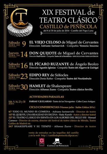 [Img #50225]Este viernes, 8 de julio, comienza la XIX edición del Festival de Teatro Clásico Castillo de Peñíscola, un evento que se desarrollará hasta el día 30 de este mes, con cinco obras representadas, además de actividades didácticas, como las conferencias que se celebrarán cada viernes en torno al teatro clásico. La cervantina ‘El viejo celoso’, a cargo de la compañía italiana Venezia Inscena, en coproducción con la canaria Reymala, abrirá el sábado la programación en el Patio de Armas (22:30; 8 euros). El día anterior, en el Salón Gótico del Castillo (20:00), conferencia-espectáculo de Adriano Iurissevich (Venezia Inscena) con el título de ‘Tutto il mundo e’ commedia’. Y como cada sábado, a partir de las 20:00, recorrido por las calles del Casco Antiguo a cargo del Teatro de los Navegantes bajo el nombre de ‘Farsas y juglarías’.