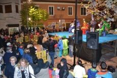 Después, con la música tradicional de la Colla de Dolcainers i Tabaleters L'Embolic, la comitiva se desplazó hasta la plaza Mayor. Sobre un escenario, los tres Reyes repartieron cientos de regalos a los niños de la localidad, que hacían cola pacientemente hasta que eran llamados. Para hacer la espera más llevadera, la Asociación de Amas de Casa repartió roscón y chocolate entre los asistentes de forma gratuita.