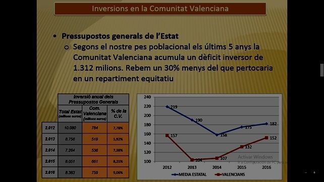En el mateix sentit s'ha pronunciat la portaveu adjunta de Compromís a les Corts valencianes, Mònica Àlvaro. Àlvaro ha demanat a Moliner que el PP recolze la moció que ha presentat la coalició per al pròxim ple de dimarts que ve. "Sembla que a Moliner li és igual que no tinguem rodalies al nord, o que l'AVE que ens promet Moragues no acabe d'arribar mai". La diputada de Compromís ha subratllat que "el finançament que rebem els valencians anualment és de 258 euros MENYS que la mitjana espanyola; si incloem Euskadi i Navarra, la xifra arriba a 970 euros menys. Així, les aportacions de l'Estat solament cobreixen el 80% dels serveis públics fonamentals".