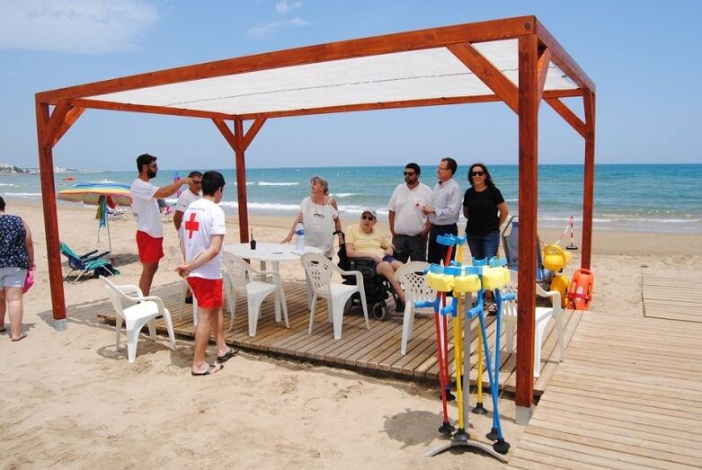 Alcala-Alcossebre Council has taken another step towards the integration and enjoyment of our beaches for disabled people. Within its policy of installing accessible spaces, it has added a new area on the Cargador beach in Alcossebre in addition to that which already exists on the Romana beach. The service, which has become operational this week, has two platforms with awnings over them, showers and disabled toilets, amphibious seats and other equipment to facilitate entrance into the water for the users, assisted by staff from the Red Cross.