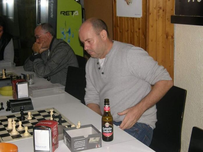 Albert-Gil (0-1) Manolo en el corrillo final, dio una lección de ajedrez. Nadie diría que ha estado ausente del ajedrez 5 años. En el problema que expuso Juanito, Gil vio un doble con la dama en mitad del tablero, a torre rey, con 3 jugadas de antelación. Y eso en cuestión de segundos. Propio de Vallejo o Ivanchuk.