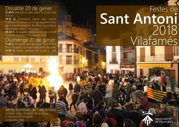 L’Ajuntament de Vilafamés ja prepara les activitats per a celebrar la tradicional festivitat de Sant Antoni, un calendari que s’obrirà el pròxim dissabte dia 13 al nucli de la Bassa de les Oronetes i que arribarà al poble el dia 20. Ese día, la primera de les activitats previstes es la benedicció dels rotllos que, com és costum, es portarà a terme al carrer Sant Antoni a les 12 del migdia.