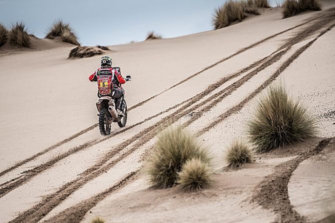 Los pilotos iniciaron este sábado la primera parte de la primera de las dos etapas Maratón que el Dakar cuenta en esta edición. Tras la jornada de descanso, la capital de Bolivia ha quedado atrás y el nuevo campamento se sitúa en Uyuni, donde los pilotos llegaron tras un frío y lluvioso enlace por carretera desde La Paz hasta Oruro. Allí ha el inicio de la especial que ha terminado en el cuartel militar de Uyuni, donde los pilotos pasarán la noche. En esta etapa Maratón, la asistencia mecánica del equipo está prohibida, con lo que los propios pilotos son los únicos autorizados a realizar el mantenimiento o reparación en la moto.