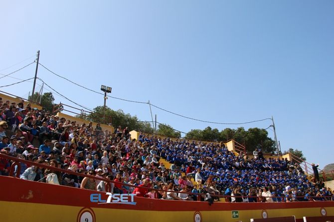 Finalizado el recorrido, la plaza de toros fue escenario de una exhibición de las habilidades y equipos empleados por la Guardia Real. En primer lugar, el presentador ofreció una breve historia de los orígenes y funciones de este cuerpo, para a continuación dar paso a la Banda de Guerra del Escuadrón de Escolta Real, ejercicios de doma con rienda larga y paso de aros, finalizando con la entrada en posición de una pieza histórica de artillería y el disparo de salvas con un cañón de 105 mm.