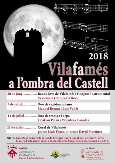 El ciclo 'Vilafamés, a l'ombra del Castell' se abre el próximo sábado, 30 de junio, con un concierto de la Banda Jove y el Conjunt Instrumental de la Asociación Cultural La Roca, que actuarán en la plaza de la Font, a las 23 horas. La programación se alargará durante los tres sábados siguientes del mes de julio, según explica el concejal de Cultura, Longi Gil, que señala que “en esta edición se ha querido dar prioridad a los músicos de Vilafamés en los cuatro conciertos programados”.