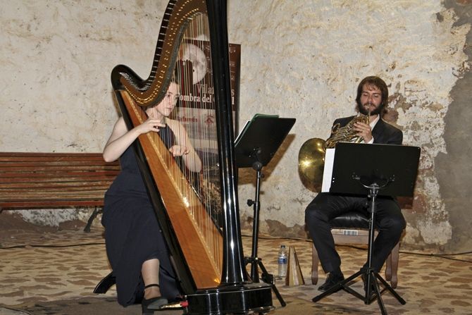 El dúo de trompa y arpa, formado por Cristian Palau y Valentina Casades, conmovió el público que asistió al concierto "Vilafamés, a l'ombra del Castell". Una actuación que constó de cinco piezas, dos de las cuales han sido arregladas para arpa y trompa por los mismos intérpretes, puesto que, según explicó Casades, el repertorio original para estos dos instrumentos es muy limitado.