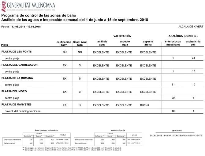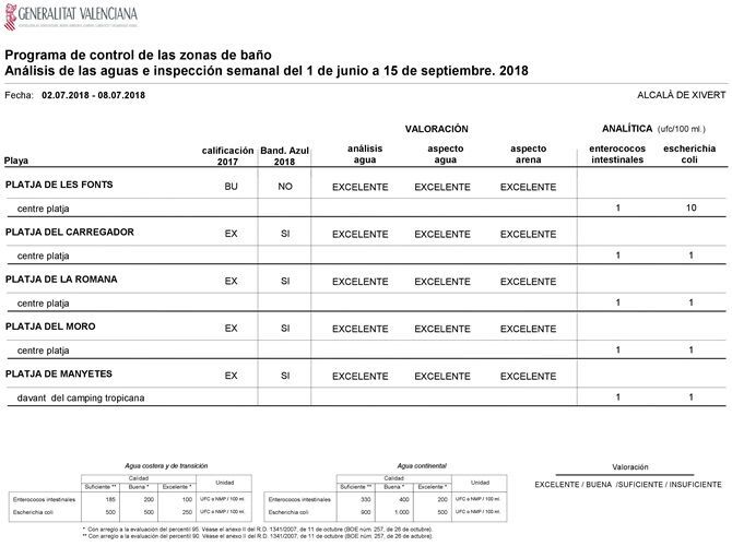 Davant les informacions aparegudes recentment arran d'un comunicat del Grup Municipal Socialista en el qual es posa en dubte la qualitat de les aigües de la platja de les Fonts, l'Ajuntament d'Alcalà-Alcossebre ha volgut llançar un missatge tranquil·litzador a la població i al sector turístic del municipi per insistir que l'episodi d'abocaments que va obligar al tancament de la platja, al juliol de l'any 2017, està completament resolt. Després de la detecció del focus de contaminació es van iniciar treballs d'inspecció a l'entorn de Les Fonts, estenent-se a una àrea molt més gran, tant en infraestructures públiques com en instal·lacions privades. Posteriorment, es van realitzar obres de renovació del sanejament en diversos punts de l'entorn de Les Fonts. Totes aquestes tasques es van coordinar, en tot moment, entre l'Ajuntament, la Direcció general de l'Aigua de la Generalitat Valenciana, EPSAR i empresa concessionària. Al maig de 2018, el director general de l'Aigua ja va anunciar que totes les analítiques que s'estaven realitzant certificaven que la qualitat de l'aigua era apta i que possiblement el focus de contaminació es devia a una suma de factors sent complicat situar una localització concreta. A més, insistia que aquest tipus d'episodis són habituals en els municipis de costa. De fet, diversos municipis de la comarca han patit tancaments de platja durant aquest estiu, mentre que a Alcossebre no s'ha produït cap.