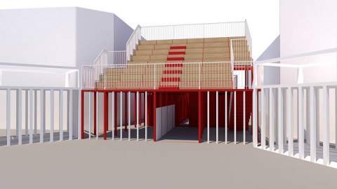 D'altra banda, s'ha projectat un cadafal metàl·lic annex, però independent al corral a l'hora del muntatge. Aquest constarà d'una zona inferior vinculada a la plaça amb barrots de protecció que compleixen la normativa taurina vigent i dues portes abatibles, una per a evacuació en cas necessitat i una altra per a l'eixida dels animals que provenen del corral i que tenen el seu pas per sota del cadafal. En un dels costats se situarà l'escala d'accés a la graderia de seients per a espectadors.
