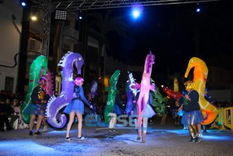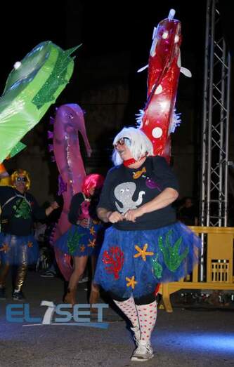 La temática marina también fue la inspiración de la colla Cada 2x3, con unos originales arrecifes marinos de color azul con faldas de tonos anaranjados.