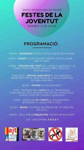 L'Associació Juvenil Pont de l´Agüelo Queixalet, en col·laboració amb el Motoclub de Bar en Bar i l´Ajuntament de Santa Magdalena, ja ha donat a conéixer la programació de les Festes de la Joventut 2019, que es celebraran el dissabte, 13 de juliol, com a avantsala de les Festes Patronals.