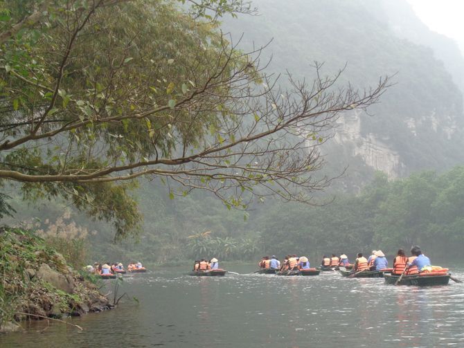 A pocos kilómetros de Halong se encuentra Tam Coc, lo que algunos han llamado Halong en tierra porque, en efecto, el paisaje es muy similar, con los enormes peñascos forrados de vegetación, los paredes verticales y las formas deslumbrantes, pero sustituyendo las turquesas aguas del golfo de Tonkín por extensos arrozales en todas las gamas de verde y amarillo, solo interrumpidos por el tranquilo cauce del río Ngo Dong y las cientos de pequeñas barcas conducidas por remeros y sobre todo remeras que las surcan tranquilamente.