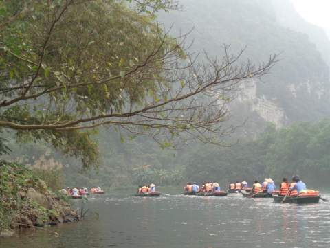 La principal diferencia de este recorrido con los que se hacen en la bahía de Halong es la sensación de intimidad, porque aunque haya decenas de barcas que siguen el mismo curso, uno siente la soledad, se percibe claramente el suave batir de los remos, el chapoteo del agua, el arrullo del viento... Todo parece que está ahí para que uno los disfrute, cada peñasco, cada extensión de arrozales, cada pájaro que nos sobrevuela, cada aleteo de los patos, cada Martín pescador que salta al paso de la barca. El placentero viaje solo se ve interrumpido, a veces, por algún vendedor ambulante que propone una fresca bebida... para el remero, aunque la paga el pasajero. Casi nunca la consumen y con frecuencia te la ofrecen a mitad de precio cuando avanza el recorrido.