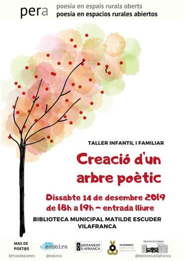 El fin de semana del 14 y 15 de diciembre llega a Vilafranca cargado de actividad. El sábado 14, el certamen PERA de poesía en espacios rurales abiertos llega a Vilafranca con diversas actividades para grandes y pequeños en la Biblioteca. De 11h a 13h Lola Mascarell dirigirá un taller de poesía para mayores de 16 años y de 18h a 19h se realizará un taller para público infantil y familiar de creación de un árbol poético. Las actividades están organizadas por la asociación Esboira, Mas de Poet@s, el Ayuntamiento de Vilafranca y la Biblioteca.