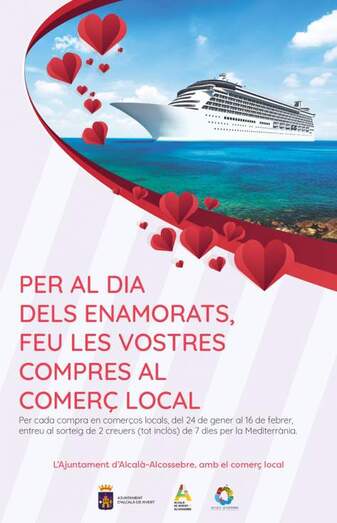 Dentro de las campañas de promoción del comercio local, la Concejalía de Comercio de Alcalà-Alcossebre innova sorteando dos cruceros por el Mediterráneo, de siete días de duración y con todos los gastos incluidos, entre los que realicen sus compras en los comercios adheridos, dentro del período comprendido entre el 24 de enero y el 16 de febrero, coincidiendo con las compras del Día de los Enamorados. Los clientes podrán obtener un cupón de participación en cada compra que realicen en los comercios adheridos y posteriormente entrarán en el sorteo de los cruceros.