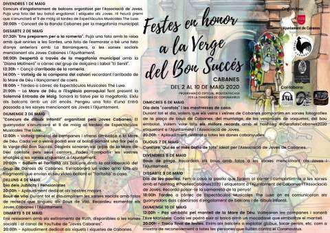 Las fiestas en honor a la Virgen del Buen Suceso de Cabanes estaban previstas para ser celebradas del 2 al 10 de mayo. Debido a la declaración del Estado de Alarma, el Ayuntamiento decidió suspender los festejos presenciales. Sin embargo, se ha creado una completa agenda de actividades virtual para el disfrute de grandes y pequeños.
