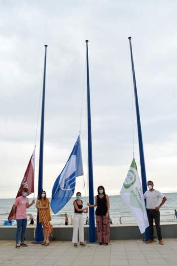 Las banderas azules y el distintivo Q de calidad turística ya ondean en las playas de Oropesa del Mar. La alcaldesa, María Jiménez, junto a los ediles de Playas y Turismo, Jordi Llopis y Silvia Arnau, respectivamente, así como la reina de las fiestas, Victoria Gómez, y su acompañante han sido los encargados de izar la bandera azul en la playa Morro de Gos y en el puerto deportivo, el único de toda la provincia que cuenta con dicho distintivo.