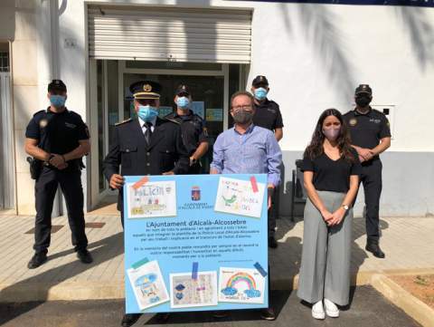 El Alcalde Francisco Juan y la edil de Policía, Selene Blázquez, han hecho entrega de un lienzo a la plantilla de la Policía Local en el que se expresa el agradecimiento y reconocimiento de toda la población a los integrantes de la plantilla por su labor durante el periodo del estado de alarma. En el texto, que está acompañado de un collage con imágenes de dibujos realizados por pequeños de la localidad durante el confinamiento, se expresa “el agradecimiento a todos y todas las que integran la plantilla de la Policía Local por su trabajo e implicación en el transcurso del estado de alarma. En la memoria de nuestro pueblo quedará para siempre el recuerdo de vuestra responsabilidad y humanidad en aquellos difíciles momentos para la población”. Para que sea visible, el lienzo quedará colgado en la entrada del retén ubicado en la plaza Justo Zaragozà de Alcalà.