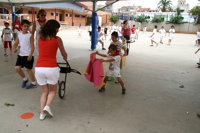 Por unas horas, los colegios Lo Campanar y La Mola, escenarios de esta escuela de verano, se tiñeron de rojo y blanco para que los pequeños, vestidos para la ocasión, corrieran delante de los toros.