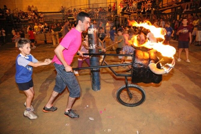 Los niños de Albocàsser disfrutaron del toro embolado infantil. Tras el Ball Pla, en la plaza de la Iglesia, los niños aprendieron cómo se debe embolar a un toro. Los encargados de portar el carro embolado acabaron exhaustos.