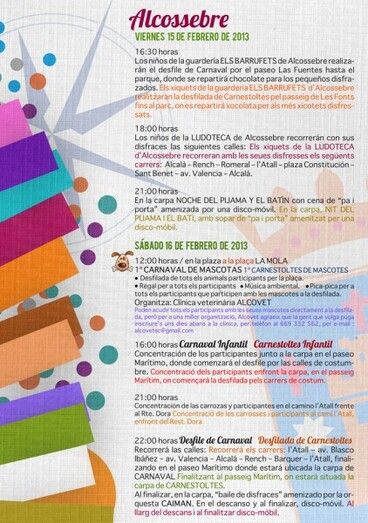 El Gran Desfile de Carnaval dará comienzo a las 21:00 horas, con la concentración de las carrozas participantes en el Cami l’Atall, desde donde partirán las comparsas desplegando su música y sus coreografías, para que todo el público pueda disfrutar de sus disfraces durante el recorrido por las calles de Alcossebre, hasta el Paseo Marítimo, donde se celebrará el Gran Baile de Disfraces en la carpa, con orquesta y disco móvil.![[Img #18382]](upload/img/periodico/img_18382.jpg)