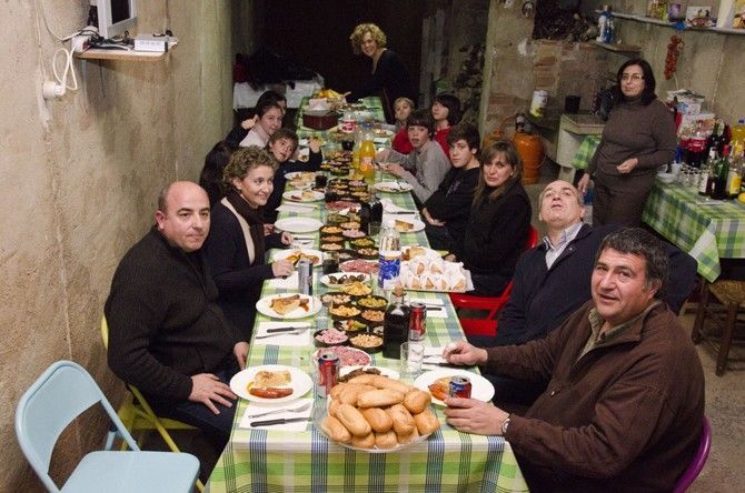 Luego tocaba el almuerzo en el Ribet: longanizas, butifarras, tocino… todo a la brasa. Pan y ajoaceite y vino para beber, y de postre, pastelitos típicos en nuestro pueblo.