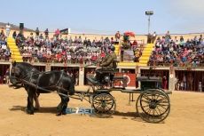 Finalizado el recorrido, la plaza de toros fue escenario de una exhibición de las habilidades y equipos empleados por la Guardia Real. En primer lugar, el presentador ofreció una breve historia de los orígenes y funciones de este cuerpo, para a continuación dar paso a la Banda de Guerra del Escuadrón de Escolta Real, ejercicios de doma con rienda larga y paso de aros, finalizando con la entrada en posición de una pieza histórica de artillería y el disparo de salvas con un cañón de 105 mm.