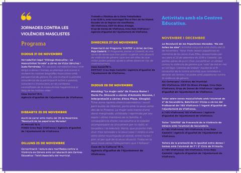 Además de la ya habitual concentración y lectura de manifiesto contra la violencia de género del 25 de noviembre, Vilafranca pone el foco durante estos días sobre las violencias machistas con un completo programa desde el jueves 21 al 28 de noviembre. Así mismo se han programado diversas propuestas junto a los centros educativos.