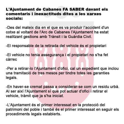La portavoz del Partido Popular de Cabanes, Ana Obiol, ha denunciado que un vehículo accidentado desde hace más de tres semanas ardió ayer en el perímetro del arco de Cabanes “ante el abandono y la inacción del PSPV”. Ana Obiol, ha lamentado que el emblema de la localidad, “una joya patrimonial y vestigio histórico de nuestro municipio, presente la imagen actual porque el PSPV ni está ni se le espera”.